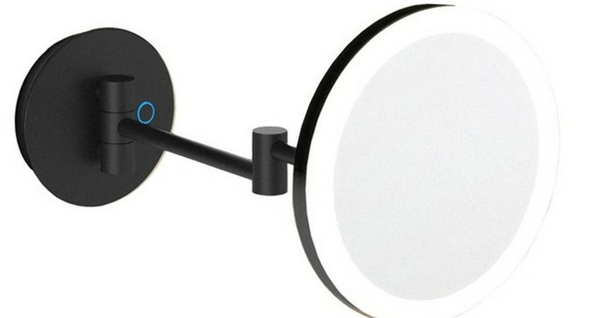 Specchio ingranditore da parete con luce LED. Ingrandimento 5x. Braccio articolato in due sezioni. Interruttore touch; un tocco veloce per selezionare luce calda/fredda. Realizzato in acciaio inox, plastica e vetro. Colore nero opaco. 4,5 W. 100-240 V. Dimensioni: Ø 20,5 cm, lunghezza braccio 42,9 cm.