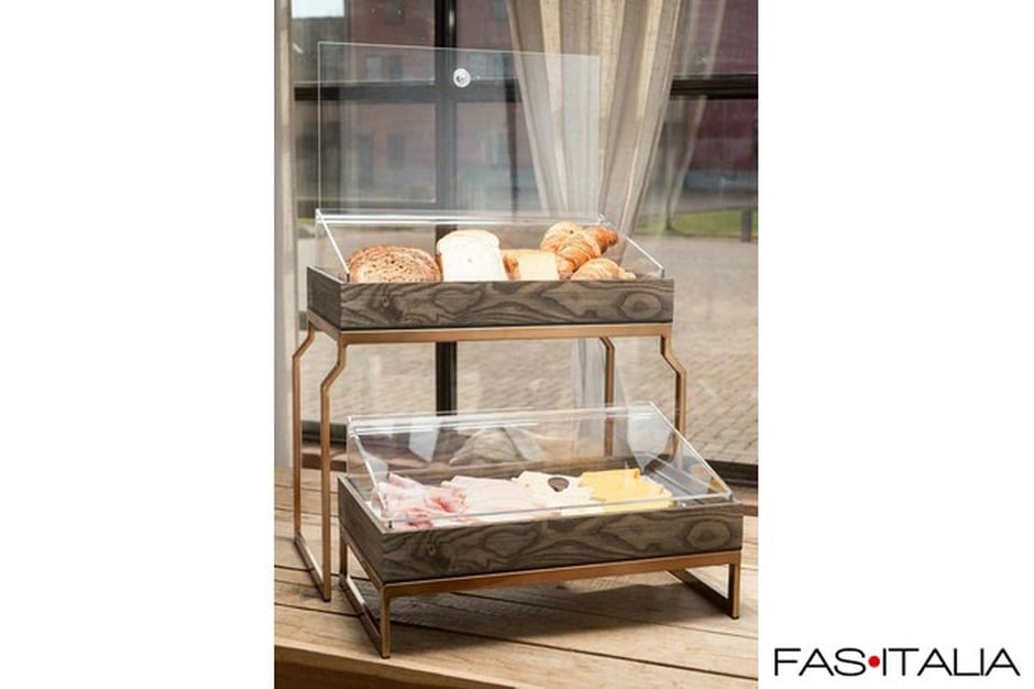 Alzata a 2 piani con espositori refrigerati è ideata per buffet colazioni, corner salati o dolci freddi in Hotel e Alberghi. Dotata di due espositori refrigerati GN 1/1 con coperchio, mantiene freschi affettati, formaggi e altri prodotti delicati, evitando dispersione di temperatura e contatti con l’aria esterna.