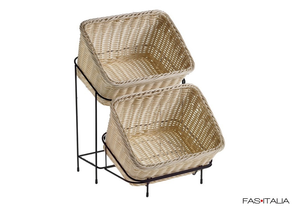 Il set cestini rettangolari con supporto è pensato per valorizzare il buffet colazioni in Hotel, Alberghi e strutture ricettive con stile ed efficienza. Il kit comprende 2 cestini inclinati rettangolari (36 × 27 × 9 cm ciascuno) montati su supporto centrale, realizzati in materiale effetto vimini che dona un tocco naturale e gradevole.