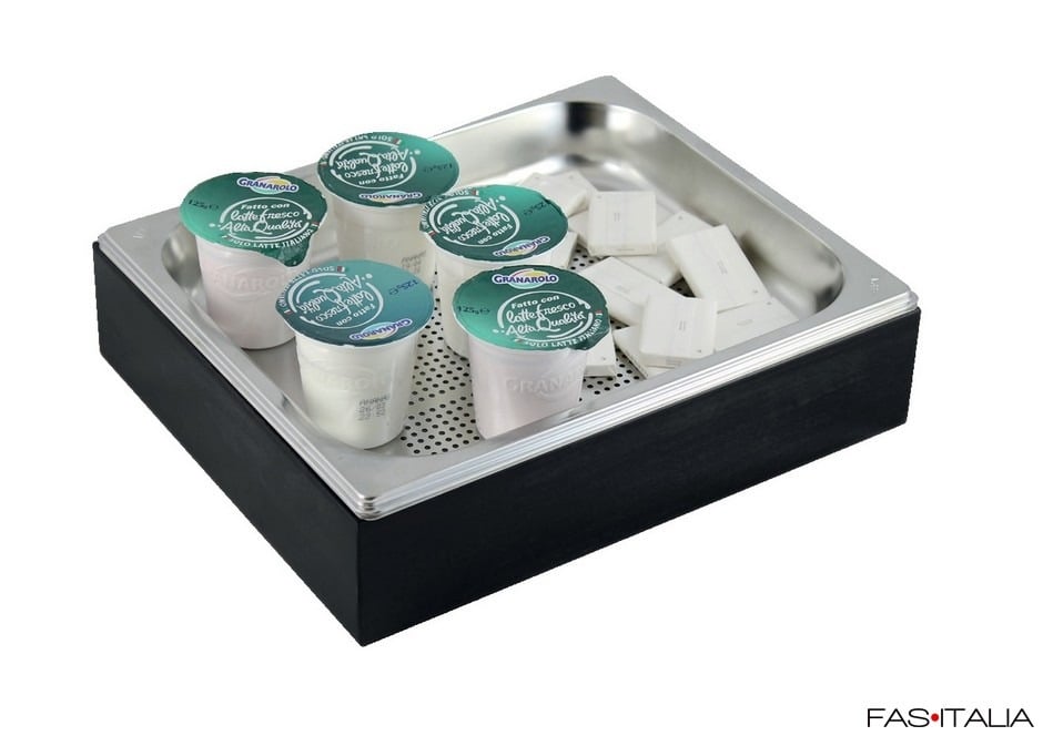 Espositore refrigerato porta burro e yogurt è pensato per le esigenze delle sale colazioni in Hotel, Alberghi e strutture ricettive. Dotato di bacinella con doppio fondo inox GN 1/2 e mattonella ghiaccio per garantire la refrigerazione, mantiene freddi e ben presentati i vasetti di yogurt e le monoporzioni di burro.
