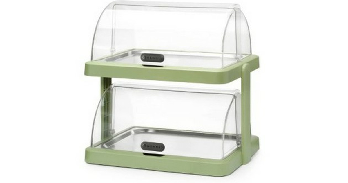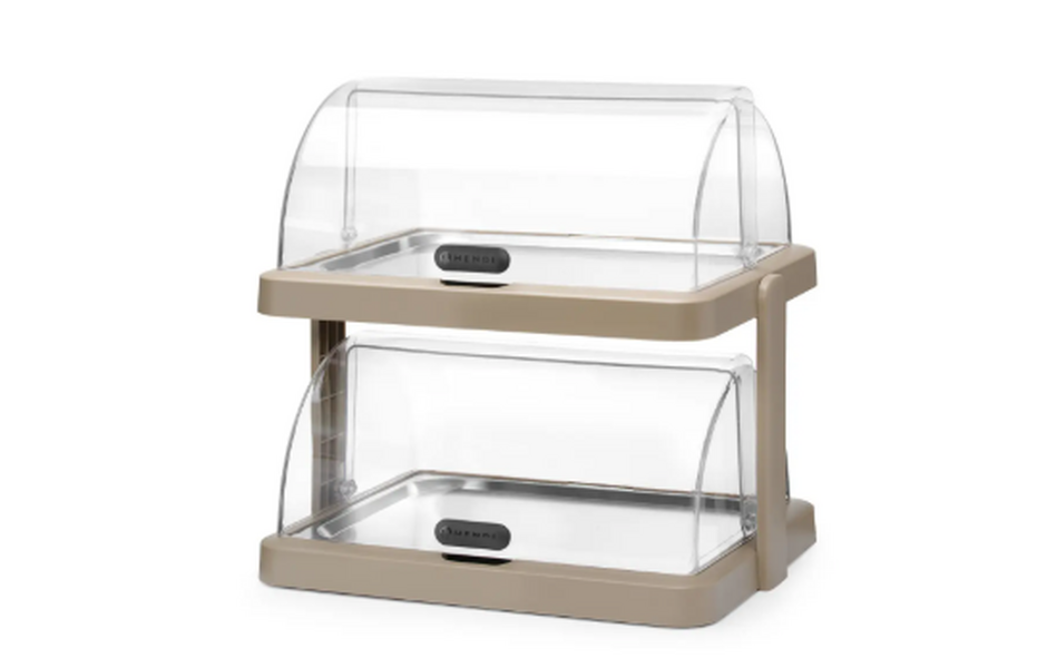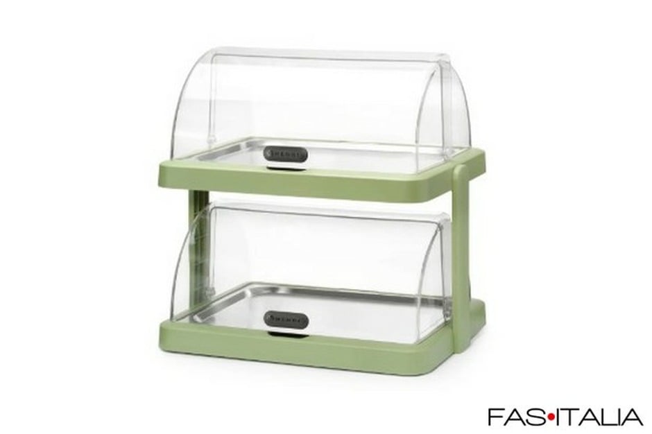 Vassoio doppio refrigerato è una composizione salvaspazio perfetta per buffet colazioni in Hotel, Alberghi. È costituito da due espositori refrigerati sovrapposti, con struttura a due livelli in plastica colorata. La dotazione include due cupole roll-top in ABS trasparente con maniglia, due vassoi in acciaio inox (40 × 30 cm) e gel pack refrigeranti che mantengono la temperatura ideale.