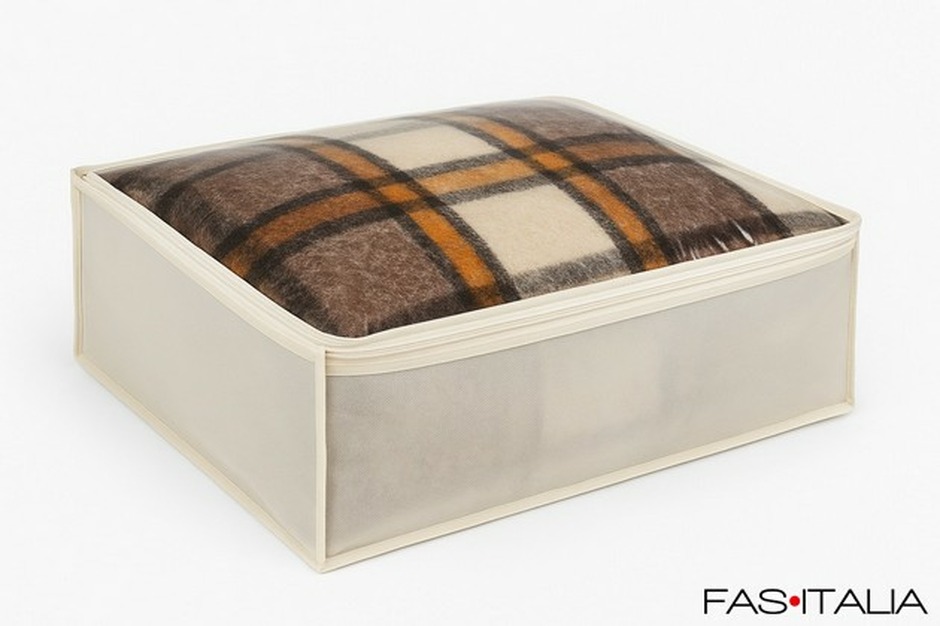 Busta per coperte e piumoni cm 60x40x20, una facciata e tre lati del soffietto in polipropilene trasparente, il resto della busta in tnt color panna. Chiusura lampo su tre lati (come una valigia). Senza maniglia.