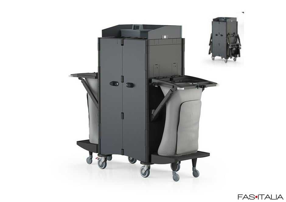 Carrello di servizio per le camere di hotel con doppio supporto sacco, tre ripiani chiusi, più uno supplementare superiore dedicato al servizio cortesia.