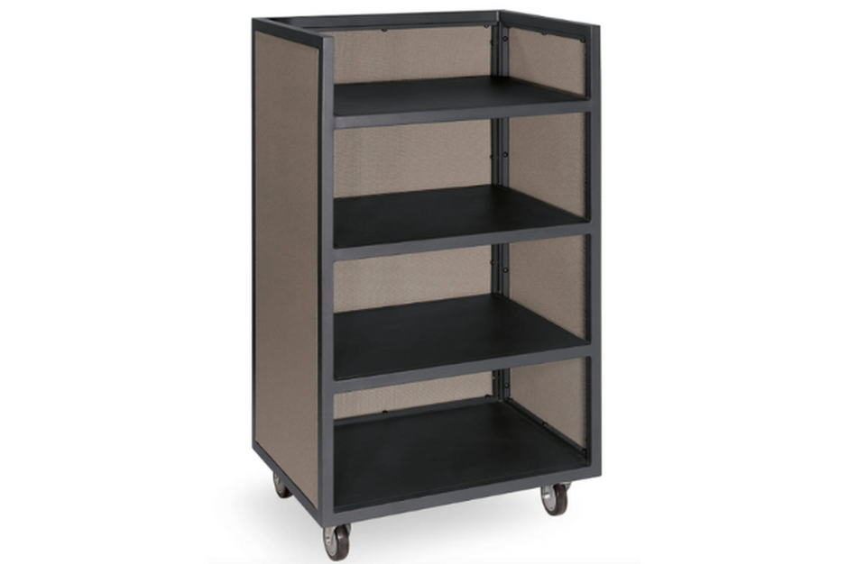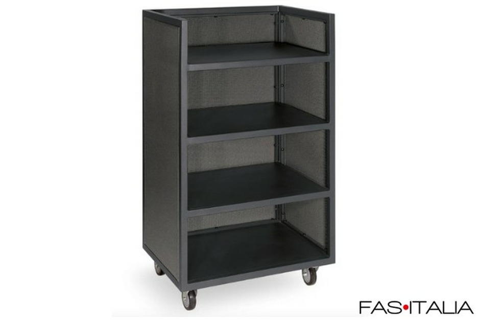 Il design minimal si integra facilmente in ambienti moderni e contemporanei. La struttura in alluminio verniciato garantisce stabilità e resistenza, mentre il rivestimento in tessuto plastico (PVC) assicura durata anche in ambienti esterni. Le ruote pivottanti con stopper permettono uno spostamento fluido e sicuro, facilitando il lavoro del personale durante il servizio.