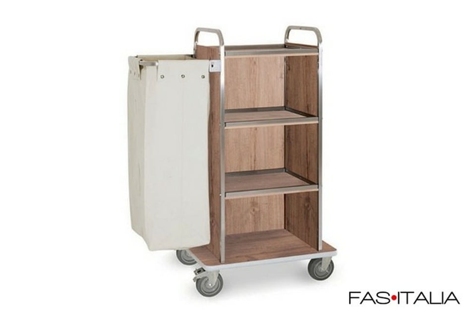Il Carrello in inox e legno con sacco è progettato per il servizio camere in Hotel, Alberghi che richiedono affidabilità e robustezza. Realizzato con struttura in acciaio inox, è dotato di pannelli su tre lati e ripiani in nobilitato, con vano posteriore chiuso per trasportare tutto il necessario per il cambio stanza comodamente.
