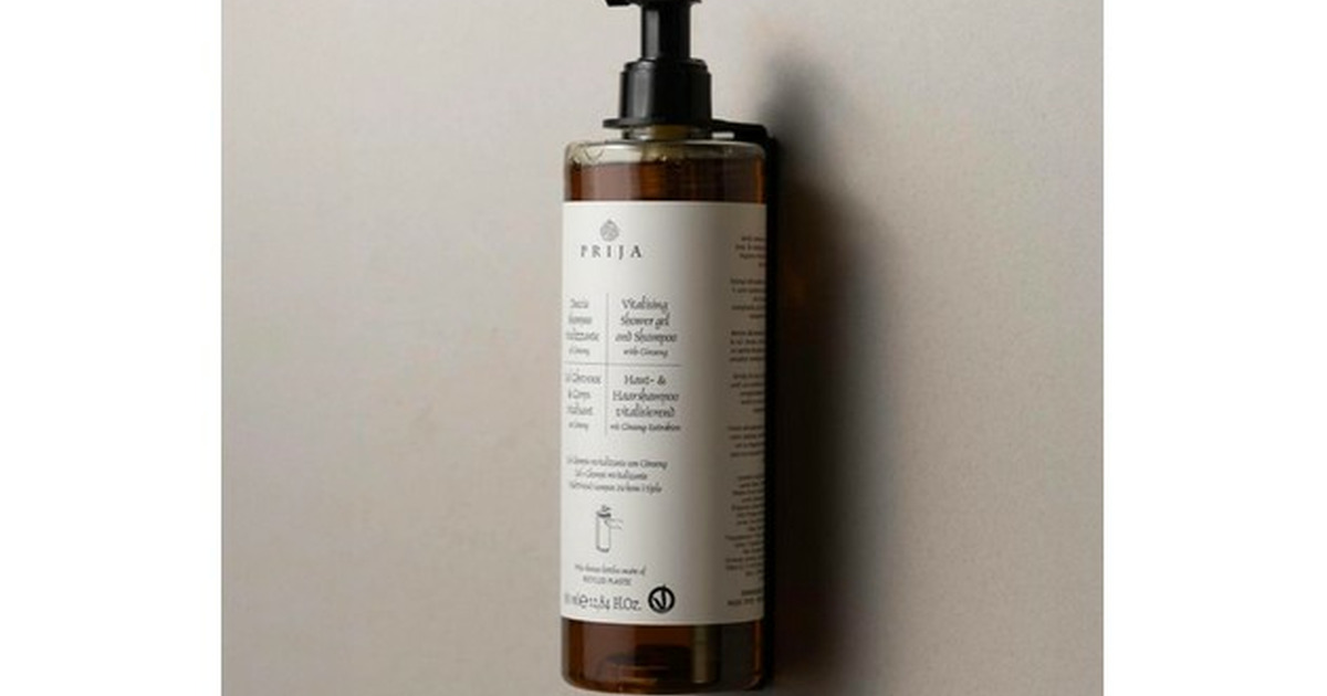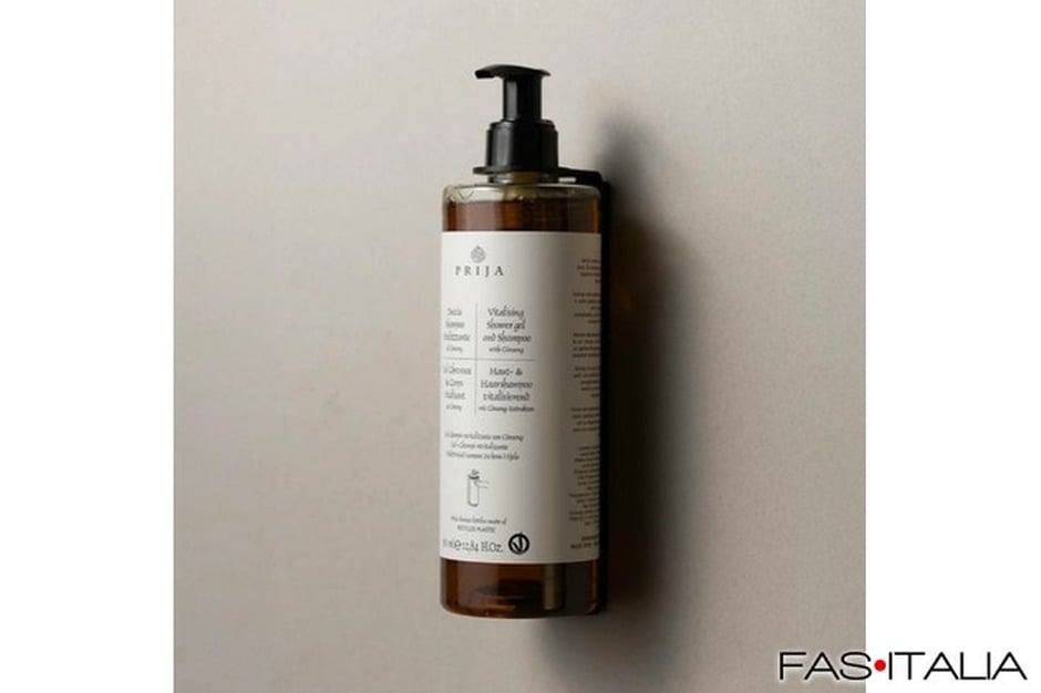 Staffa per dispenser ricaricabili sia tondi da 380 ml che quadrati da 480 ml, realizzata in acciaio inox per durare e resistere agli urti e all'ossidazione. Acciaio verniciato nero a polvere. Fissaggio a parete sia con nastro biadesivo, per evitare i fori sulle mattonelle o con viti e tasselli: tutto il necessario per entrambe le soluzioni è incluso nella confezione. La staffa è dotata di sistema antifurto: il meccanismo di blocco e sblocco del dispenser è controllato dalla chiave inclusa nella confezione. Design funzionale e ridotto al minimo che garantisce allo stesso tempo una resistenza salda alla parete dove è fissato: la staffa, grazie alle linee essenziali, quasi scompare alla vista lasciando la visuale degli ospiti libera e reggendo con sicurezza e solidità il dispenser alla parete. La confezione contiene, oltre alla staffa, la chiave di sblocco del sistema di bloccaggio, il nastro biadesivo per il fissaggio a parete senza fori, viti e tasselli. Disponibile anche in acciaio satinato, cod. 13915. Dimensioni: 3,6x4,9x21,2 cm (LxPxH).