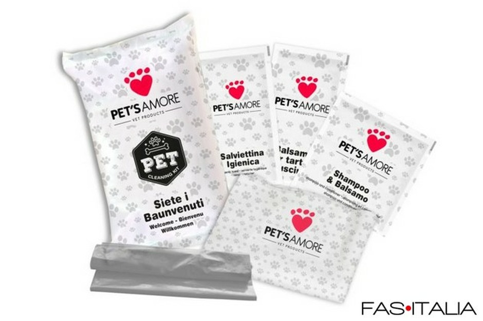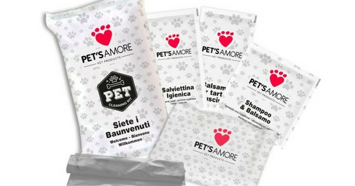 Il set è confezionato in flowpack, una soluzione igienica e compatta, perfetta per la gestione in reception o per essere lasciata direttamente in camera. All’interno sono presenti prodotti dedicati al comfort all’igiene quotidiana del cane, utili durante il soggiorno e apprezzati dai proprietari per la loro praticità.