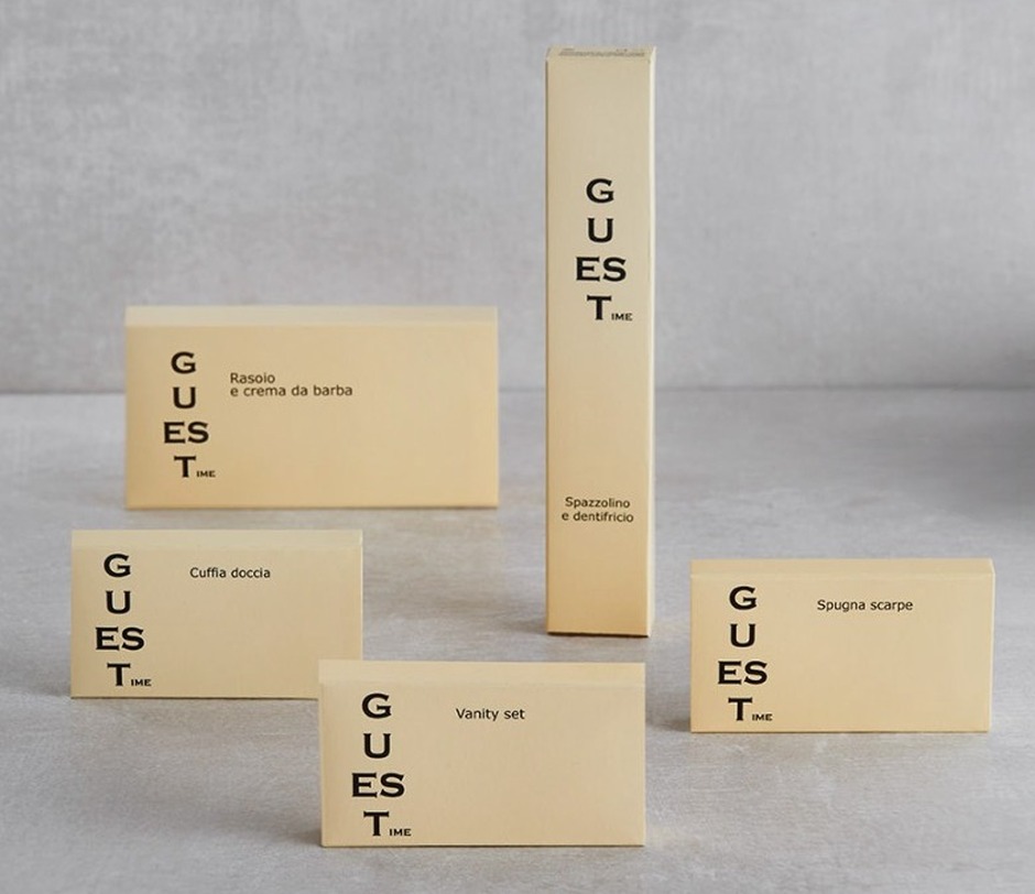 Gli accessori di cortesia sono confezionati in astucci di cartoncino, una scelta che valorizza l’immagine del prodotto e contribuisce a una presentazione ordinata e coerente. La linea Guest Time comprende una gamma completa di cosmetici e accessori, come shampoodoccia, crema corpo, sapone, cuffia doccia, vanity set e kit denti, permettendo di allestire il bagno in modo coordinato.