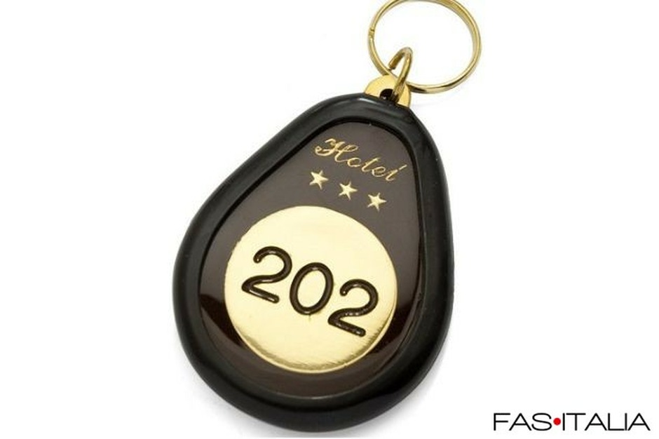 Il logo della struttura in rilievo valorizza l’identità dell’Hotel e rende il portachiavi un vero elemento di rappresentanza. Il gommino nero di protezione contribuisce a preservare infissi e superfici durante l’uso quotidiano, senza compromettere l’eleganza del modello.